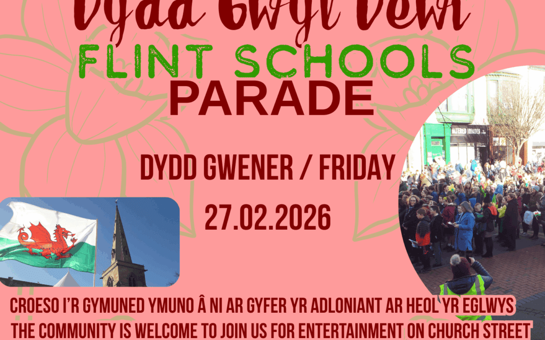 Eleni, mae Menter Iaith Fflint a Wrecsam, mewn partneriaeth â Chyngor Sir y Fflint a Chyngor Tref y Fflint, wedi trefnu gorymdaith i ysgolion y Fflint drwy ganol y dref ar ddydd Gwener, 27 Chwefror 2026.