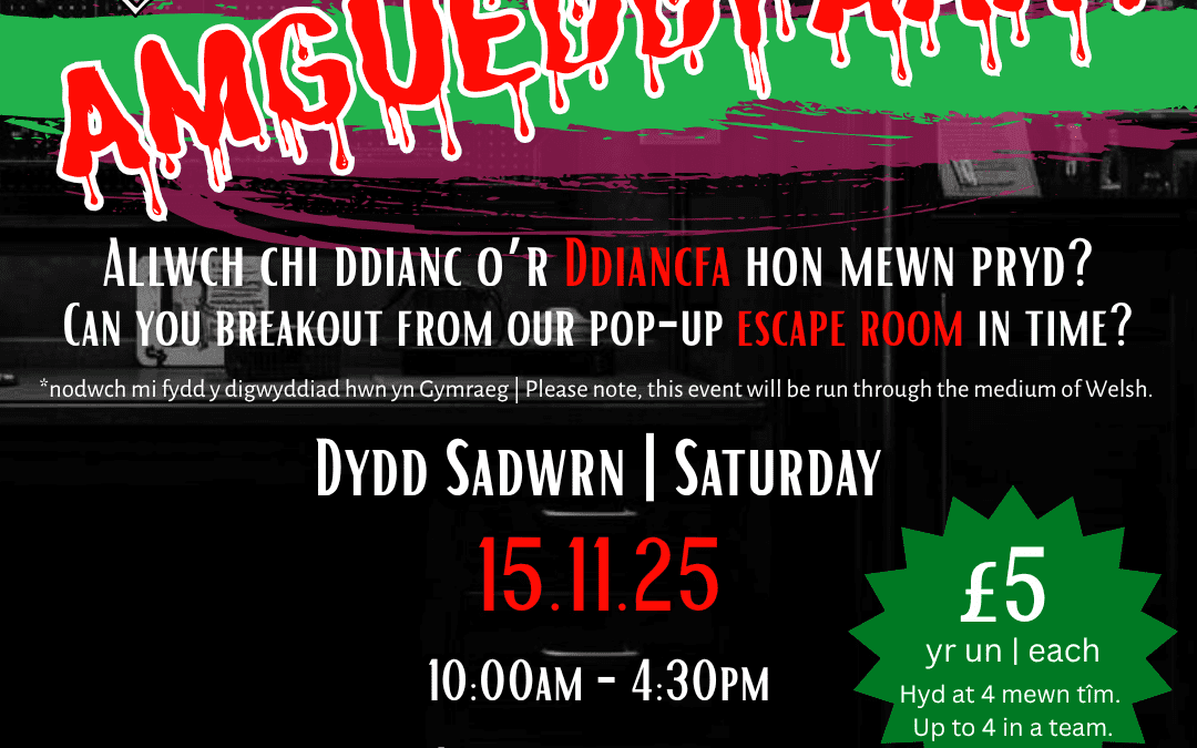Dyma gyfle i brofi eich sgiliau a chael llond Diancfa (Ystafell Ddianc) o hwyl gyda ffrindiau, criw gwaith neu fel teulu.