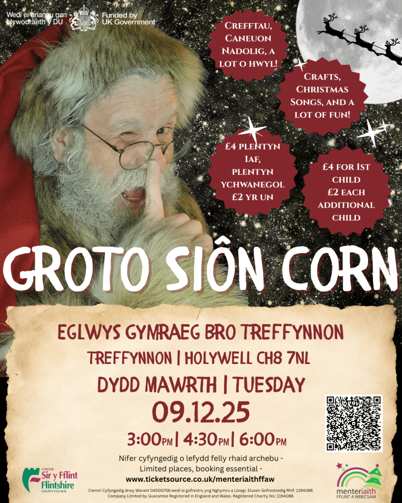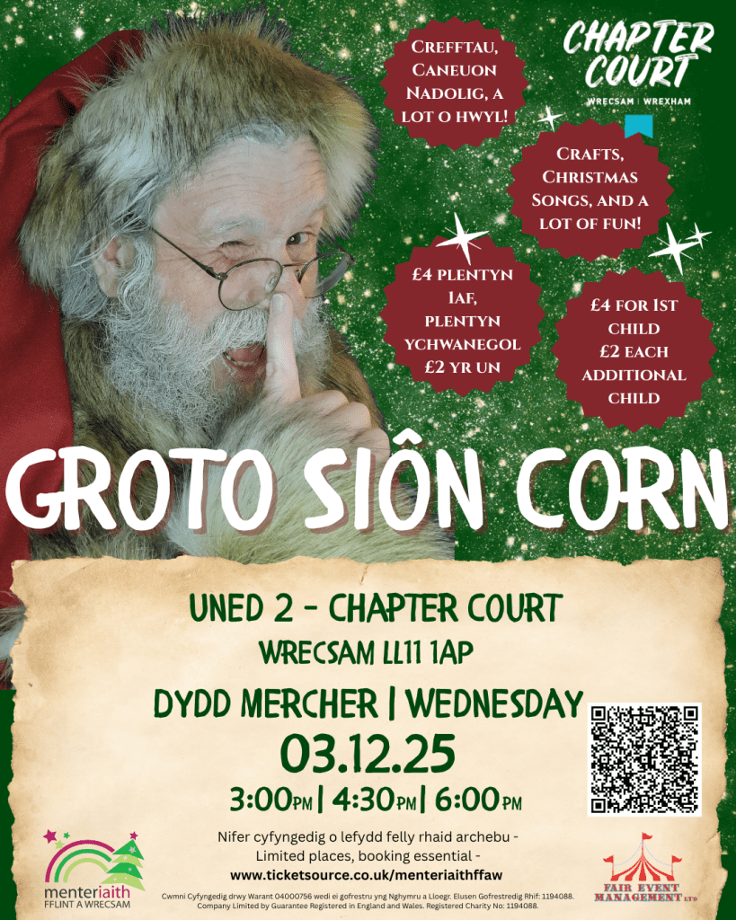 Groto Siôn Corn (Santa’s Grotto)Come and meet Father Christmas at Chapter Court, Wrecsam. Join in all the fun and create Christmas crafts, write a letter to Santa, and have a chat with him in the grotto!